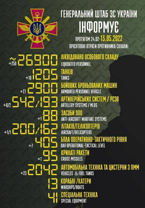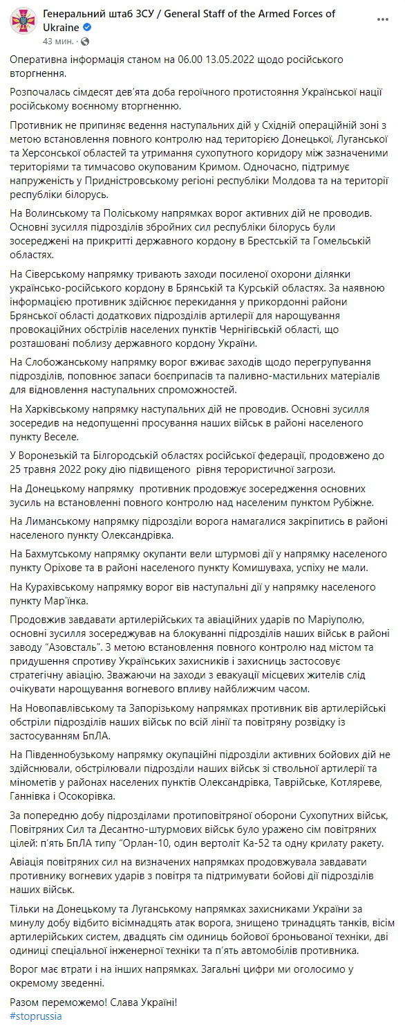 12 мая оккупанты весь день пытаются прорваться в Камышевахе и Рубежном, но безуспешно. Продолжаются бои за Воеводовку. Кроме того, в Луганской области нацгвардейцы сбили российский вертолет Ка-52».