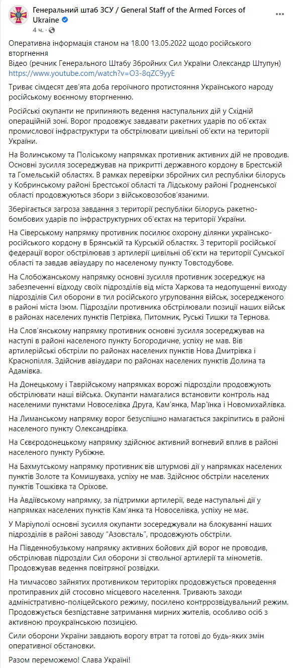 В течение всей ночи 13 мая российские оккупанты обстреливали из артиллерии и авиации территорию Азовстали, сейчас идет штурм меткомбината российской пехоты на бронетехнике (УП).