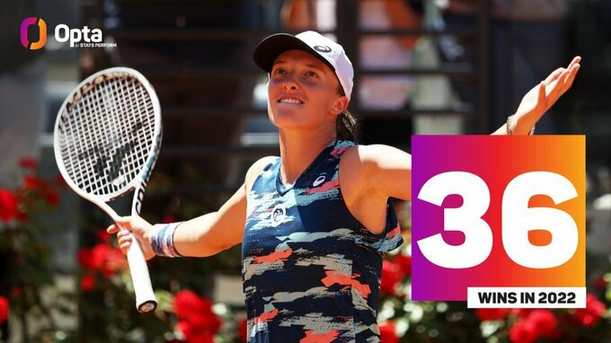 Таким образом, полька выиграла 36 матчей в этом сезоне (включая встречи Кубка Билли Джин Кинг) и сравнялась по этому показателю с полным сезоном 2021 года.