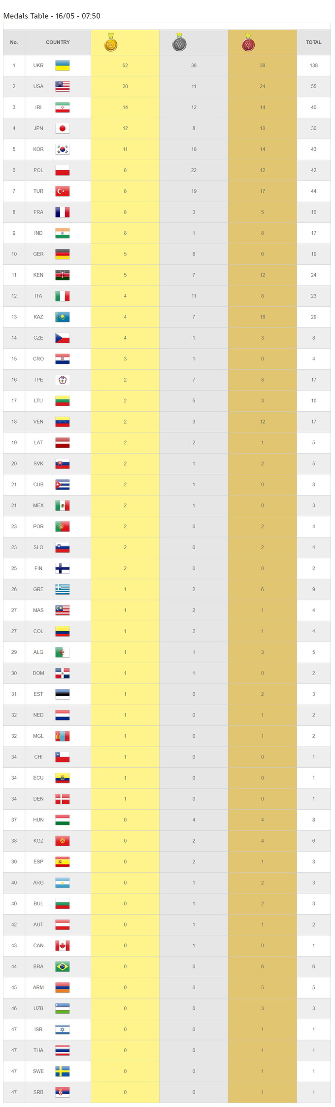 В первую тройку общекомандного зачета также вошли США с 55 наградами и Иран с 40 медалями.