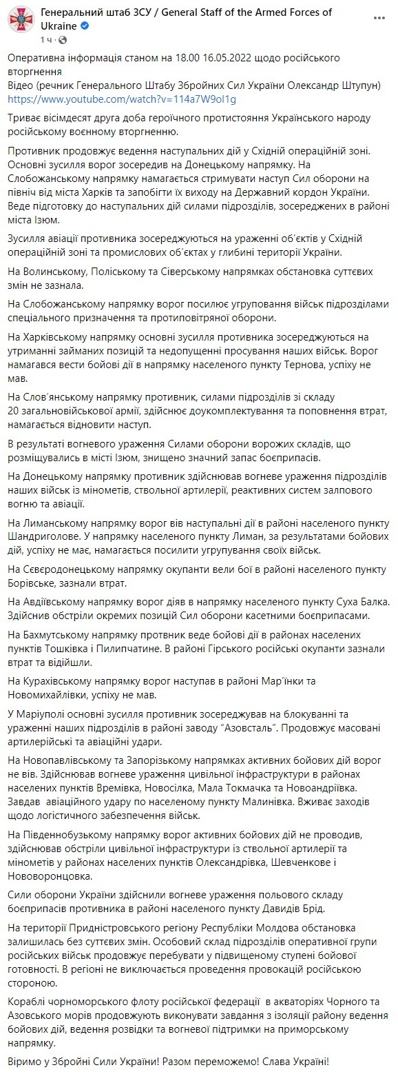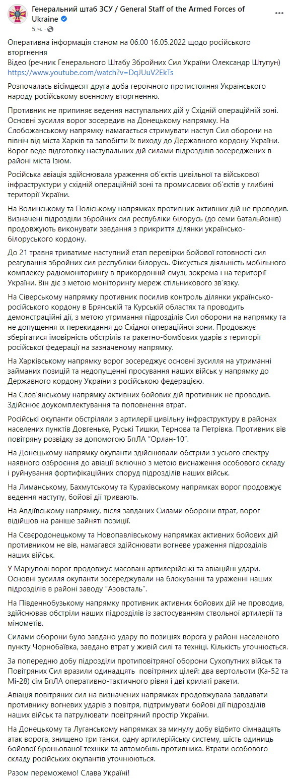 Генеральный штаб ВСУ: Общие боевые потери противника с 24.02 по 16.05 ориентировочно составили: