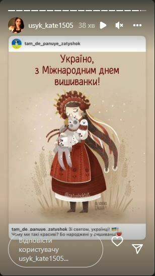 «С праздником, украинцы! Почему мы такие красивые? Потому что рождены в вышиванке», - гласит сторис в Instagram, которым поделилась Екатерина.