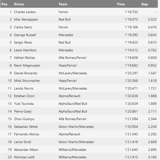 Топ-10: Леклер, Ферстаппен, Сайнс, Расселл, Перес, Хэмилтон, Боттас, Магнуссен, Риккардо, Шумахер