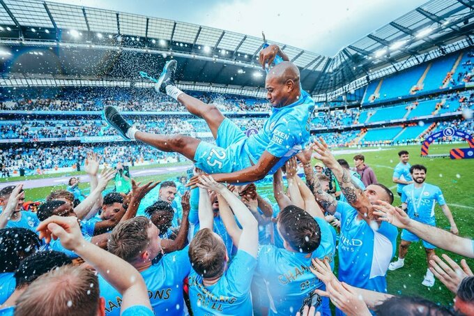 Во время празднования чемпионства игроки «горожан» ярко попрощались с 37-летним бразильцем Фернандиньо, который завершает карьеру в английском клубе.