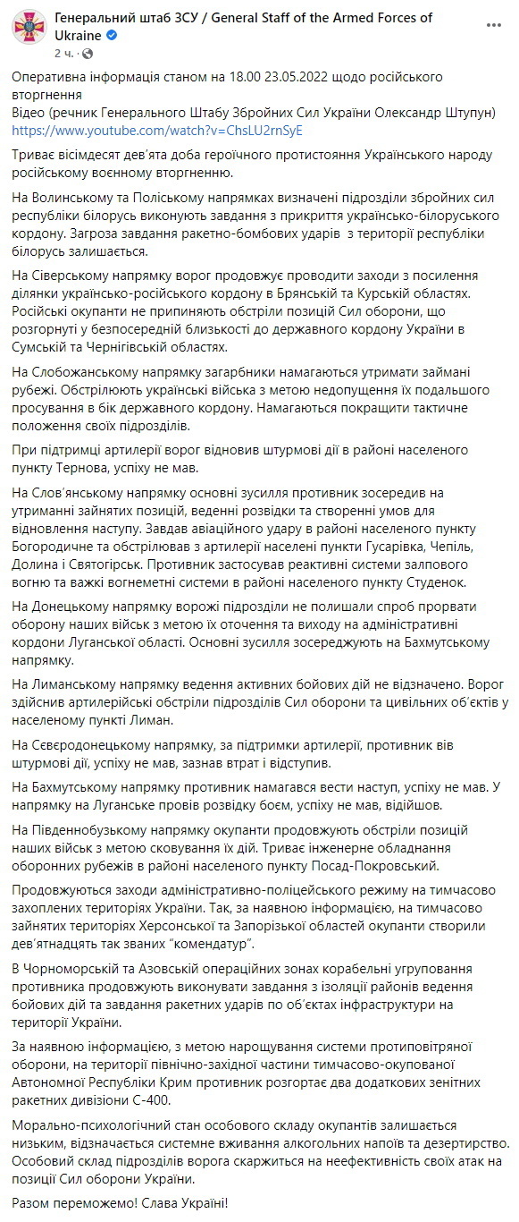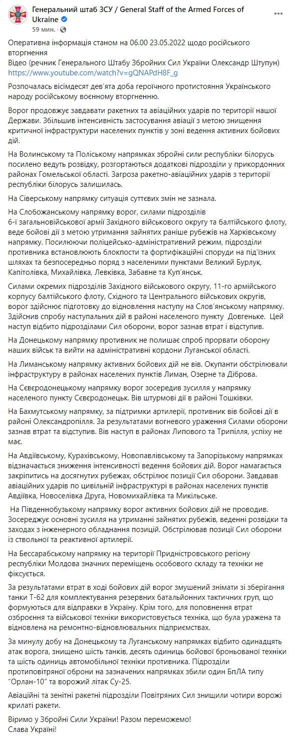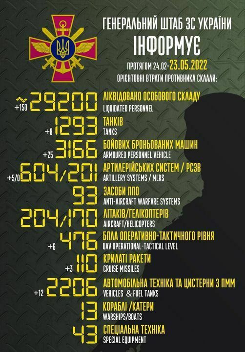 Генштаб ВС Украины: По состоянию на 23 мая боевые общие боевые потери рф в войне против Украины составили уже 29200 человек.