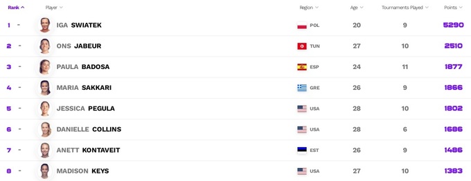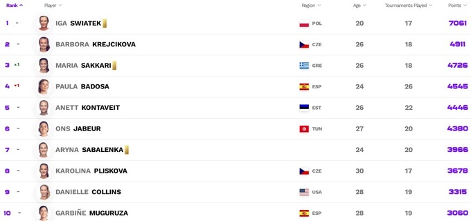 На самых верхах изменение есть только одно – Мария Саккари обошла Паулу Бадосу и впервые стала третьей ракеткой мира.
