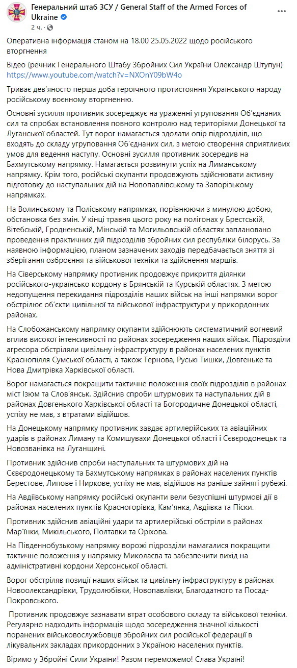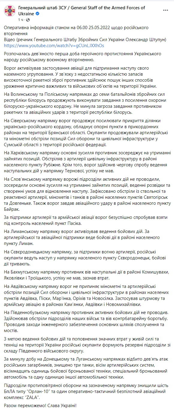 Запорожская ОВА: «Сегодня, 25 мая, в 05:13 российские войска запустили 4 крылатые ракеты по Запорожью. Одну из них сбило наше ПВО. В настоящее время обследуется пораженная территория, на месте происшествия работают соответствующие службы».