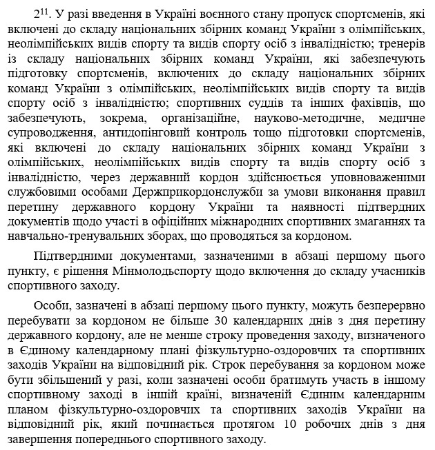 Согласно постановлению 615, спортсмены, тренеры могут покинуть Украину сроком до 30 суток для участия в международных соревнованиях и для подготовки к ним.
