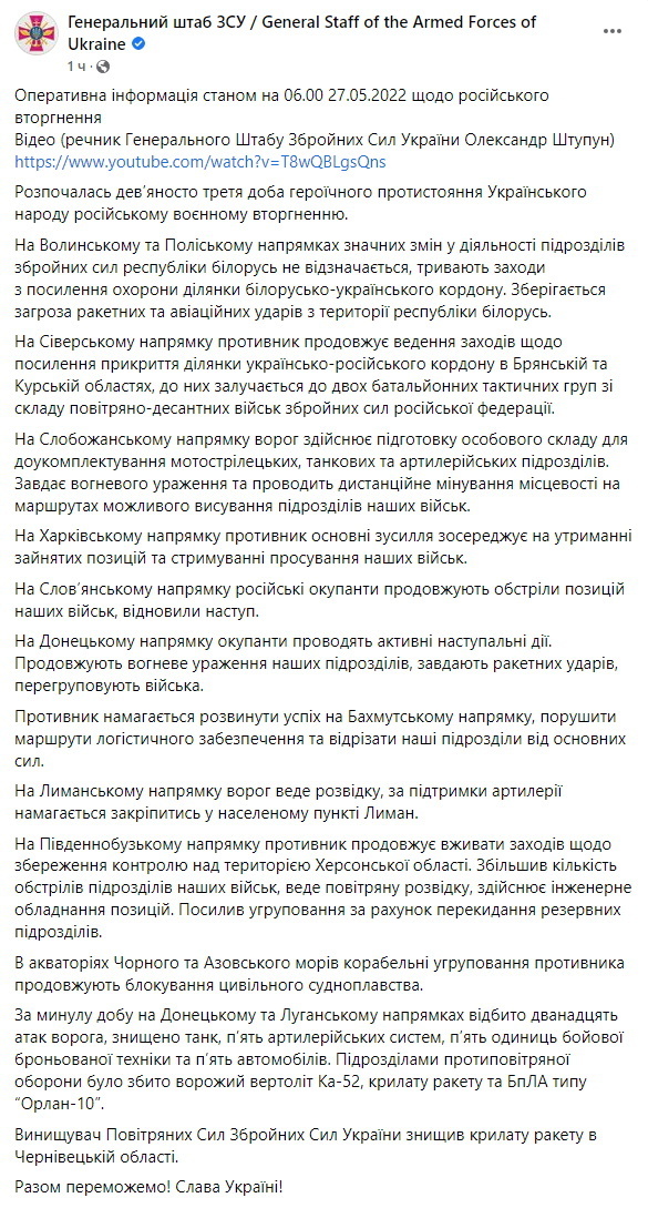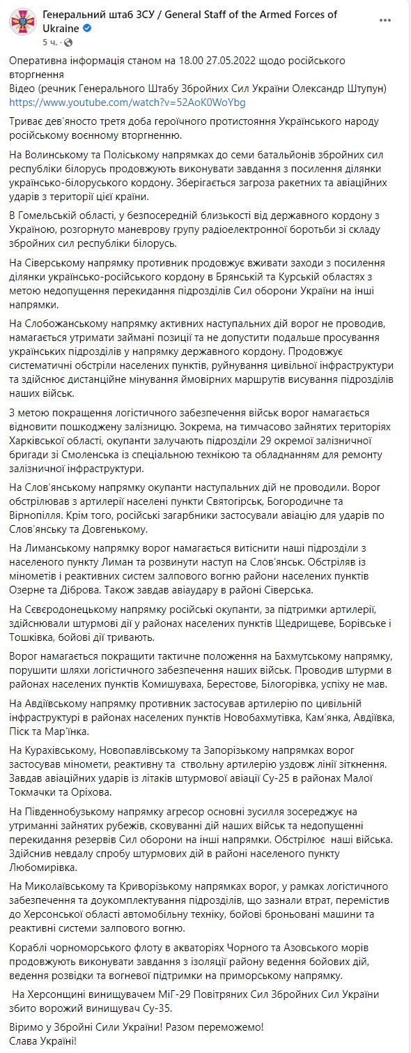 Воздушные силы Вооруженных Сил Украины: «Сегодня, 27 мая, около 14:00 истребитель МиГ-29 Воздушных Сил Вооруженных Сил Украины в небе Херсонской области сбил российский истребитель Су-35, который охотился за самолетами украинской штурмовой авиации».