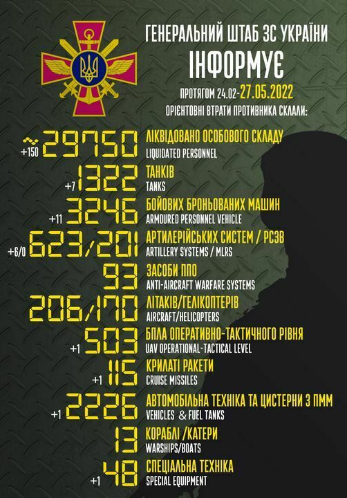 Общие боевые потери военных России с 24.02 по 27.05 составляют уже 29 750 вояк.