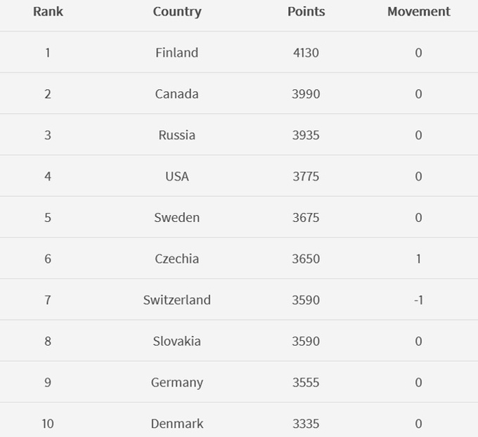 После завершения чемпионата мира по хоккею Международная федерация хоккея обновила рейтинг сборных, где на первом месте остается сборная Финляндии.