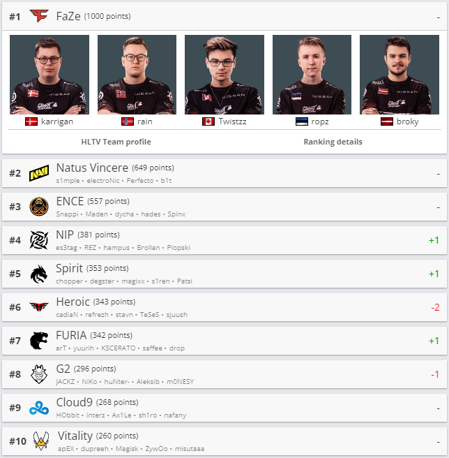 Лучшей командой мира остается FaZe Clan, которая в финале одолела Natus Vincere. Украинский клуб после отчисления российского капитана Boombl4 остаются на второй строчке. На третьей строчке ENCE.