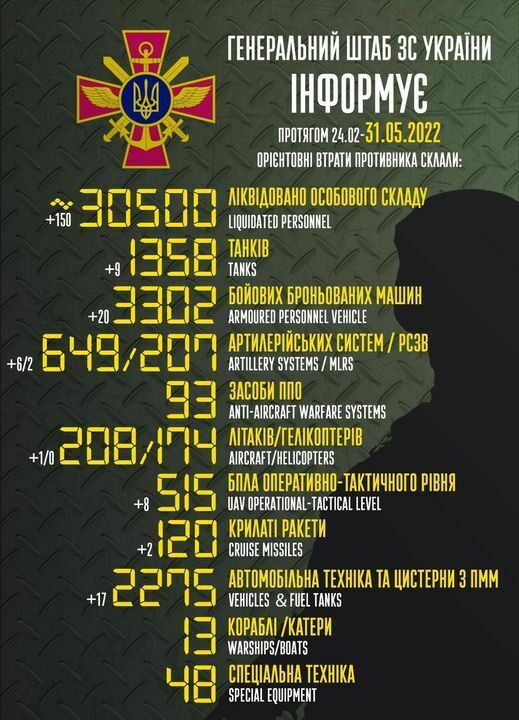 Данные Генштаба ВСУ: Общие боевые потери противника с 24.02 по 31.05 ориентировочно составили: