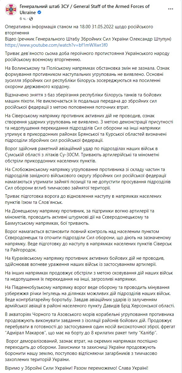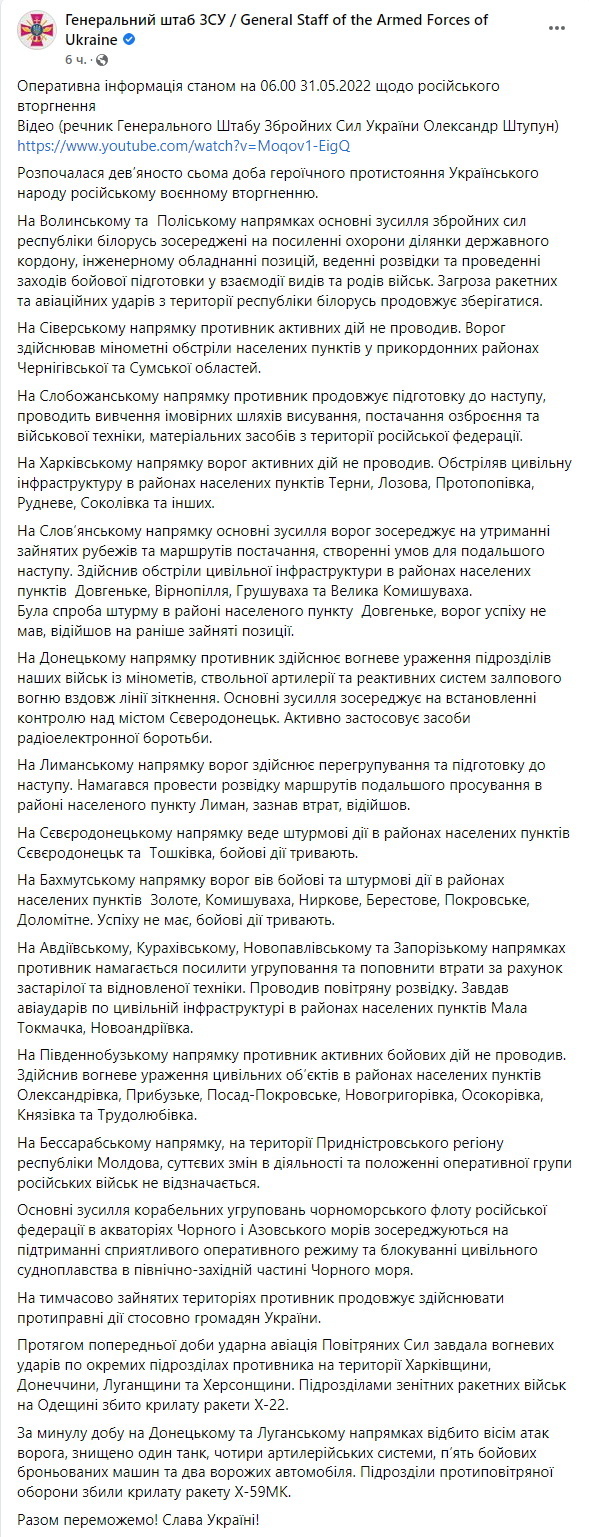 Генштаб ВСУ: Российские оккупанты готовятся возобновить наступление в направлениях Изюма в Харьковской области и Славянска, Северска и Райгородка в Донецкой области.