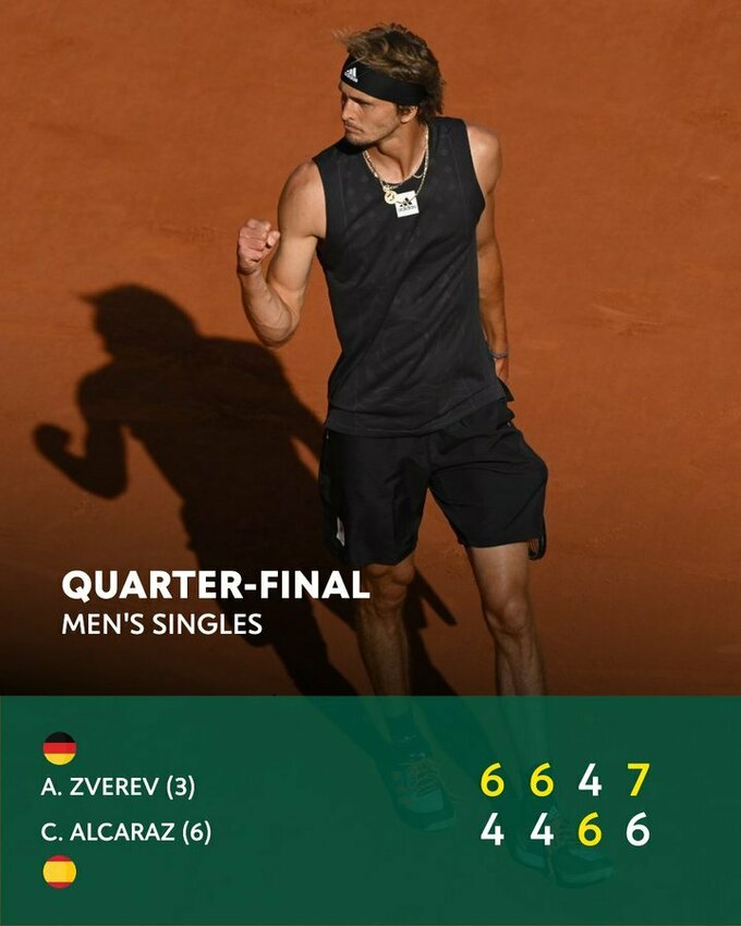 Зверев прервал катастрофическую серию из 11 подряд поражений соперникам из первой десятки в рамках турниров Grand Slam. Для Александра это будет второй полуфинал Ролан Гаррос подряд.