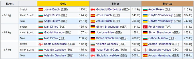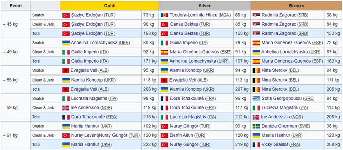 Ранее три медали также завоевала Камила Конотоп в категории до 55 кг: серебро в рывке (94 кг), золото в толчке (113 кг) и серебро по сумме двоеборья (207 кг).