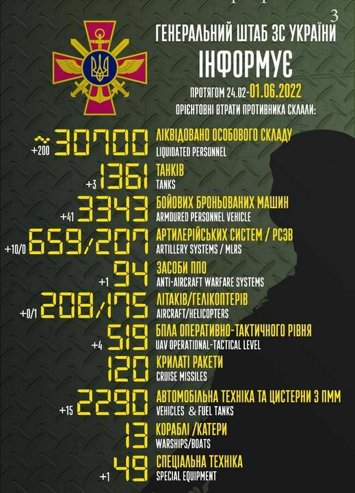 Генеральный штаб ВСУ: Общие боевые потери противника с 24.02 по 01.06 ориентировочно составили: