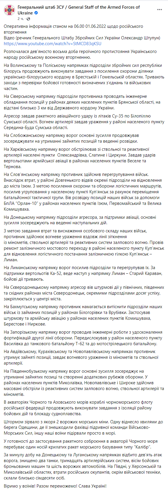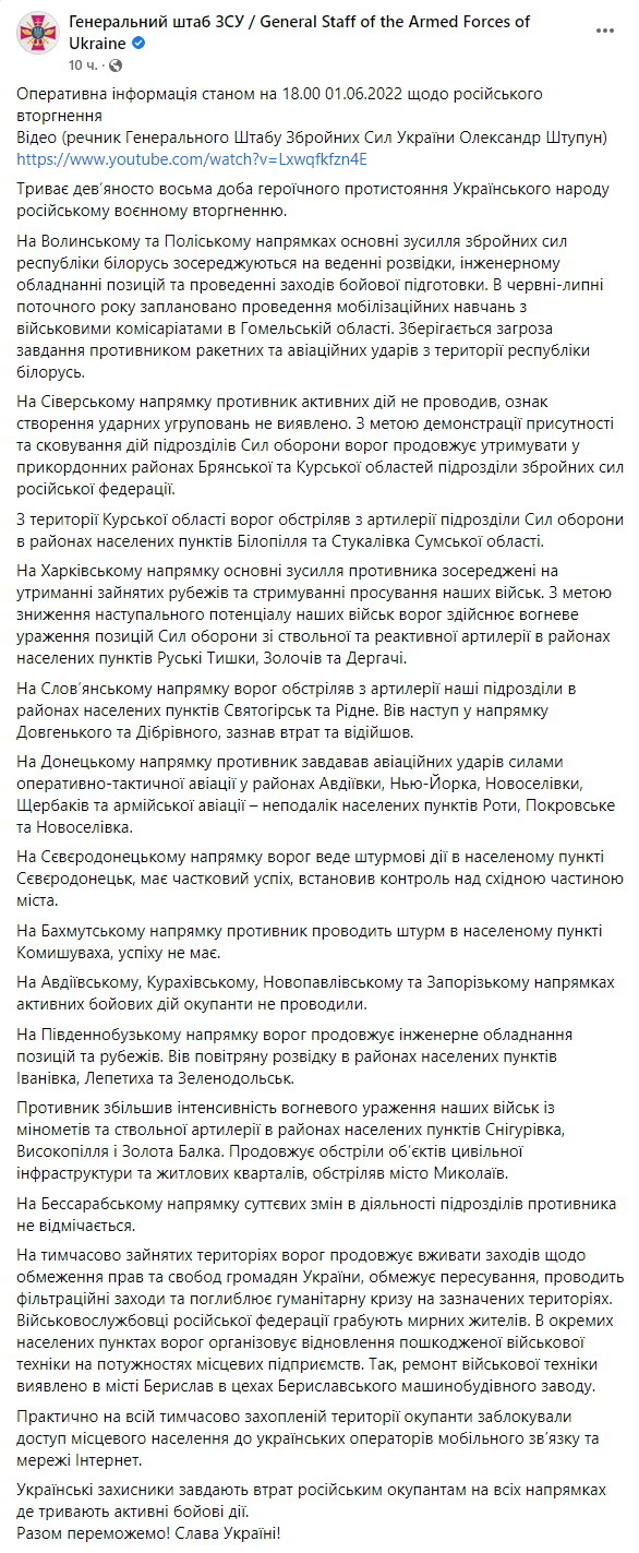 «В течение 30–31 мая на улицах Северодонецка усилились бои, русские войска приближались к центру города. Более половины города, вероятно, сейчас оккупировано российскими войсками, включая чеченских боевиков».