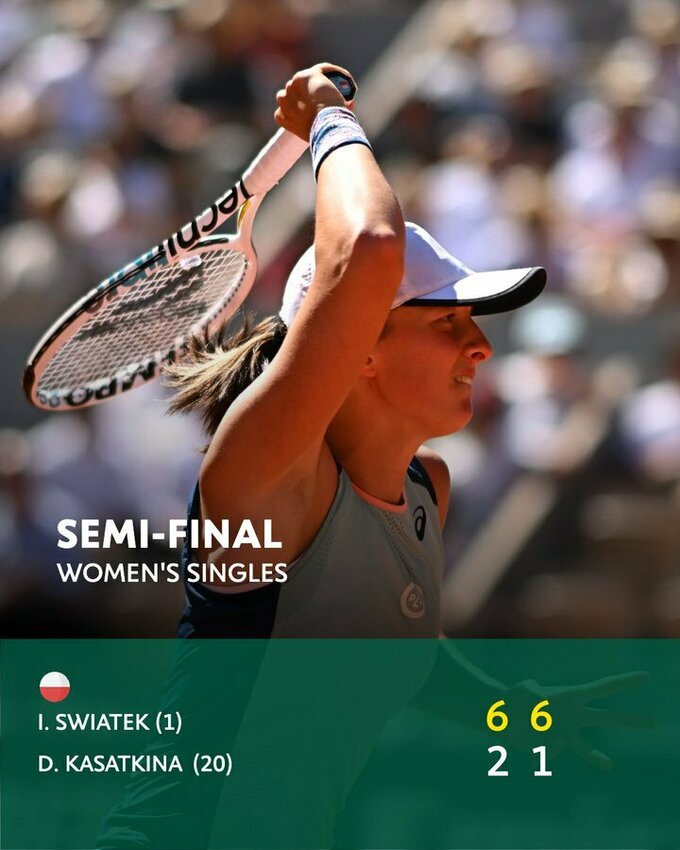 Польская теннисистка Ига Свёнтек в двух сетах переиграла Дарью Касаткину и во второй раз в карьере пробилась в финал грунтового мейджора