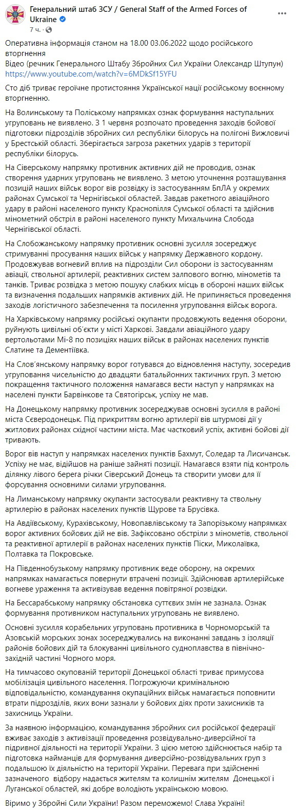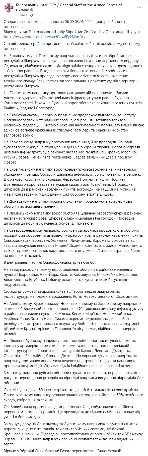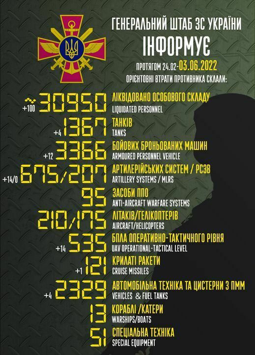 Генеральный штаб ВСУ: Общие боевые потери противника с 24.02 по 03.06 ориентировочно составили: