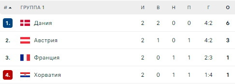 Дания захватила лидерство в группе (6 очков), у Австрии осталось 3 балла. В другом поединке группы Хорватия и Франция сыграли вничью (1:1) и набрали по 1 очку.