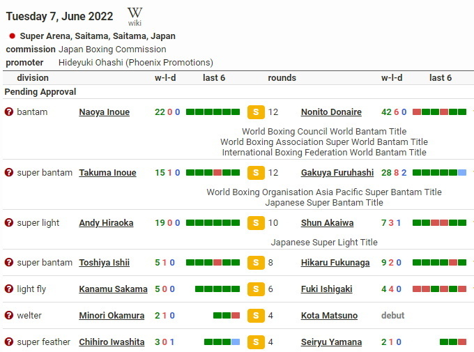 7 июня в Сайтаме (Япония) состоится шоу бокса, главным событием которого станет матч-реванш за объединение титулов между японцем Наоя Иноуэ (22–0, 19 КО) и филиппинцем Нонито Донэйром (42–6, 28 КО).