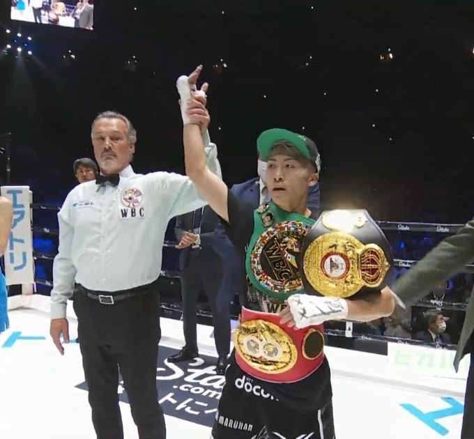Японский Монстр победил технокаутом во втором раунде и объединил пояса по трем версиям в легчайшем весе.