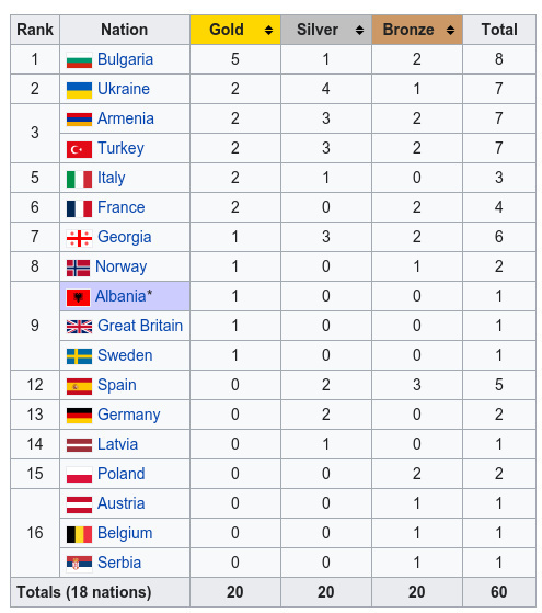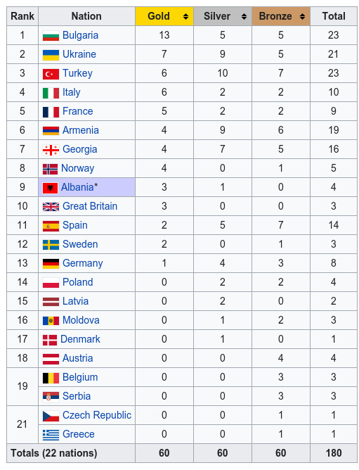 Украинские спортсмены завоевали 21 медаль (7 золотых, 9 серебряных, 5 бронзовых). Выше расположилась только сборная Болгарии с 23 медалями (13–5–5).