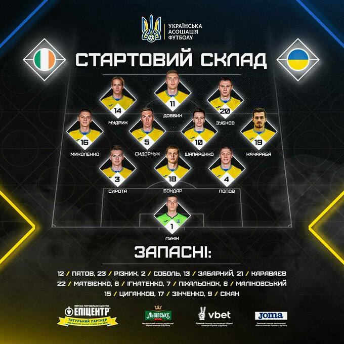 Украина: Лунин, Качараба, Попов, Бондарь, Сирота, Миколенко, Сидорчук, Шапаренко, Зубков, Мудрик, Довбик
