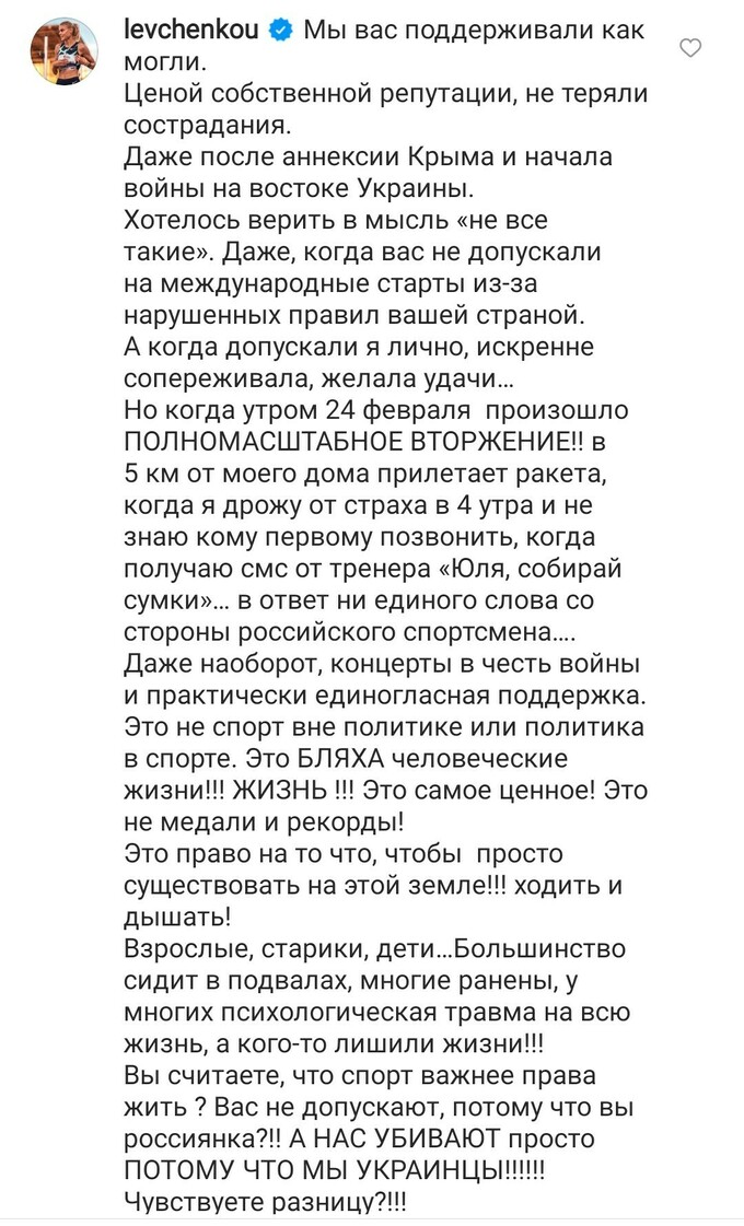 Вы считаете, что спорт важнее права жить? Вас не допускают, потому что вы – россиянка?! А нас убивают, просто потому что мы – украинцы! Чувствуете разницу?!» – написала Левченко в комментариях к посту в инстаграме.