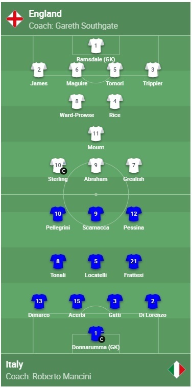 Англия: Рамсдэйл, Джеймс, Магуайр, Томори, Триппье – Уорд-Прауз, Райс, Маунт – Стерлинг, Грилиш, Абрахам
