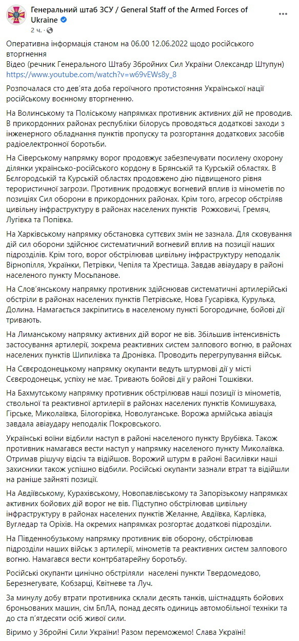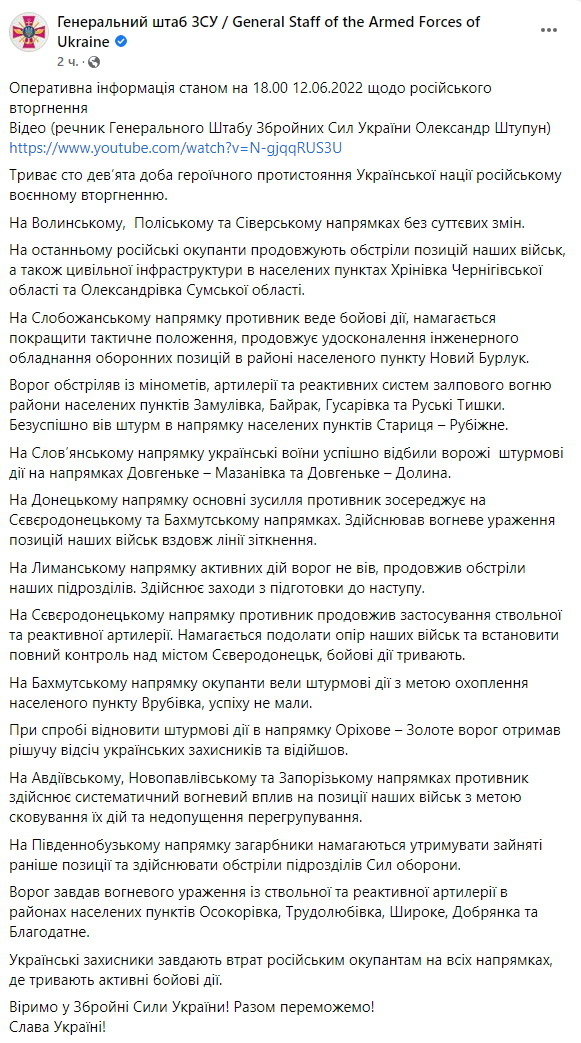 Сводка Генштаба: на Славянском направлении украинские военные отразили попытки врага атаковать, продолжаются ожесточенные бои за Северодонецк, россияне готовят наступление на Лиманском направлении.