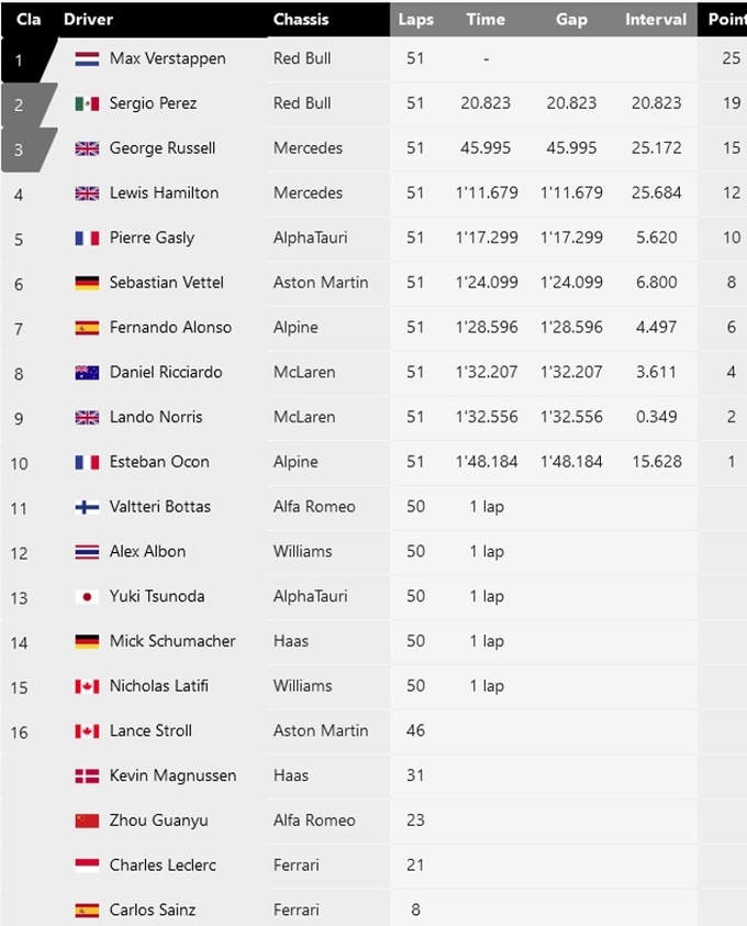Победу одержал пилот Ред Булла Макс Ферстаппен, который стартовал 3-м, но сумел финишировать первым. Топ-3 замкнули Серхио Перес и Джордж Расселл.