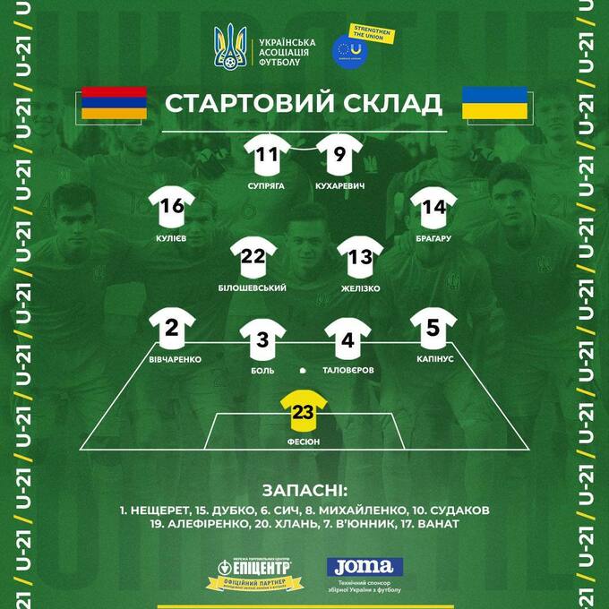 Стартовый состав Украины U-21: Фесюн, Сыч, Таловеров, Боль, Вивчаренко, Желизко, Билошевский, Брагару, Кулиев, Кухаревич, Супряга.