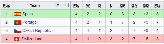 Турнирная ситуация в группе A2: Испания (8 очков), Португалия (7), Чехия (4), Швейцария (3).