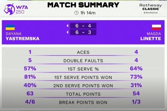Даяна Ястремская (Украина) – Магда Линетт (Польша) – 6:4, 6:3