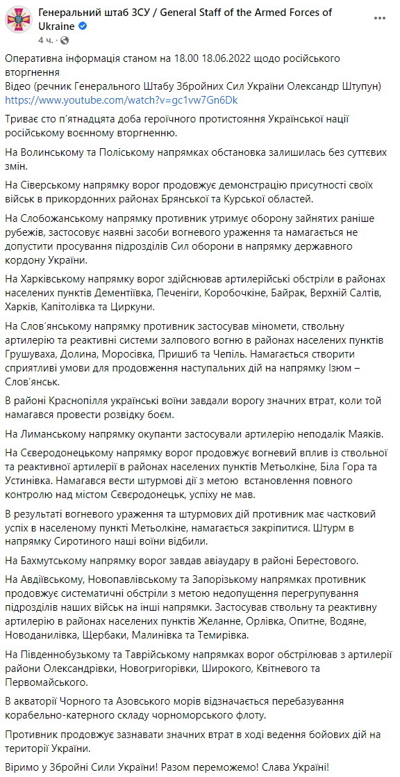 Генеральный штаб ВСУ: Общие боевые потери противника с 24.02 по 18.06 ориентировочно составили: