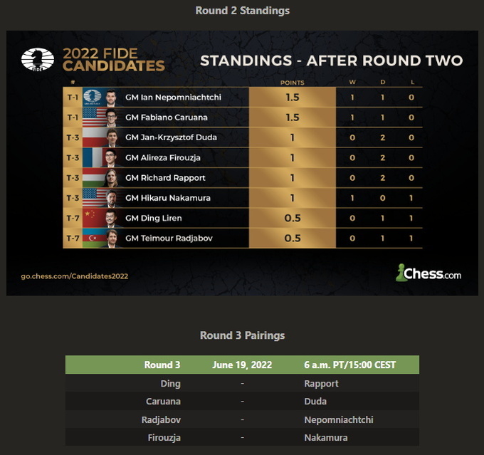 Оба лидера набрали по 1.5 очка после двух туров. Во втором туре выиграл только Хикару Накамура и вернулся на 50% набранных очков.