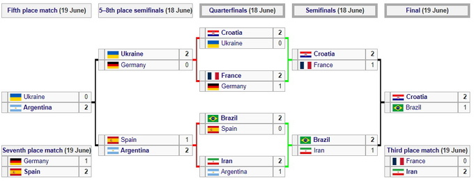 В финале у мужчин Хорватия обыграла Бразилию (2:1), а Иран выиграл у Франции в матче за бронзу (2:0).