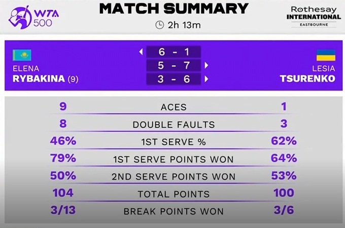 Леся Цуренко (Украина) – Елена Рыбакина (Казахстан) – 1:6, 7:5, 6:3