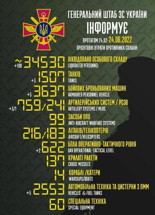 Генеральный штаб ВСУ: Наибольшие потери противник понес на Славянском и Бахмутском направлениях. Общие боевые потери оккупантов с 24.02 по 24.06 составили: