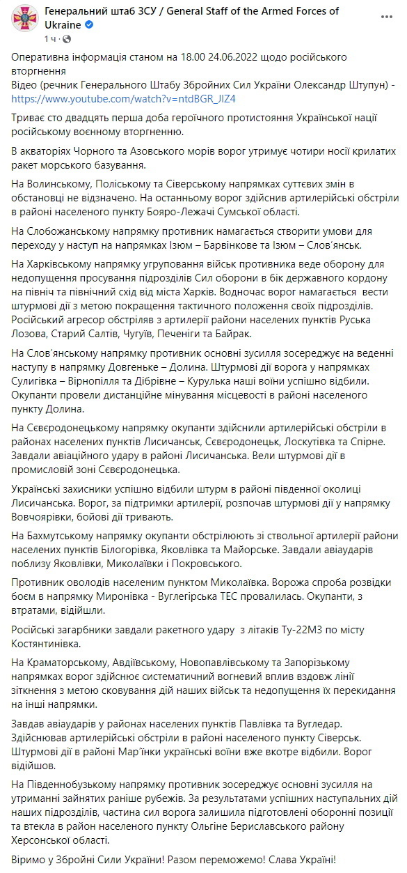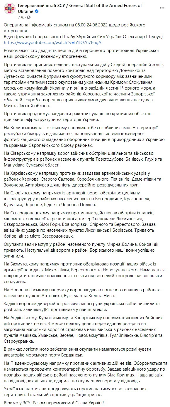 Пресс-служба командования Десантно-штурмовых войск: «24 июня на одном из направлений военнослужащим подразделения противовоздушной обороны 79 отдельной десантно-штурмовой бригады ДШВ ВС Украины был успешно сбит российский штурмовик Су-25 Грач».
