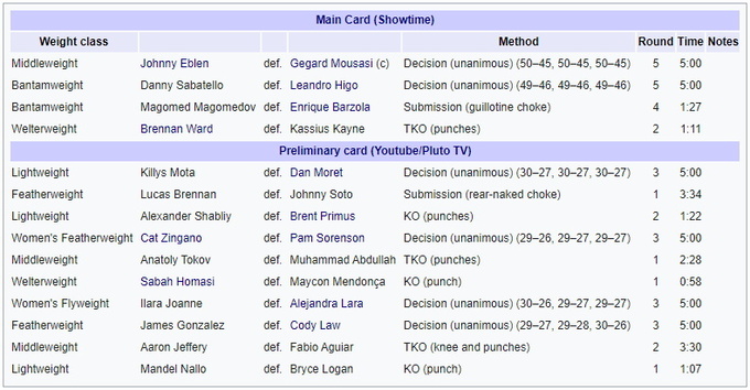 Эблен еще не потерпел ни одного поражения: у него 12 побед в 12 поединках ММА. 36-летний ветеран Мусаси имеет 49 побед, 8 поражений и 2 ничьи. Он владел чемпионским титулом с октября 2020 года.