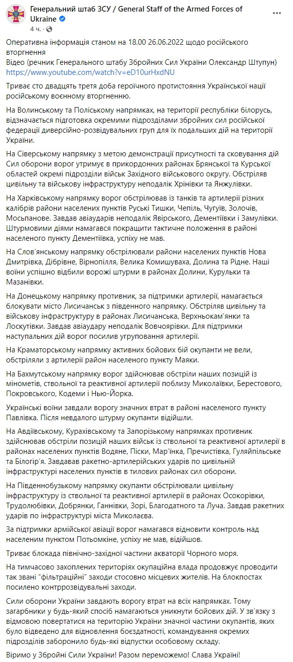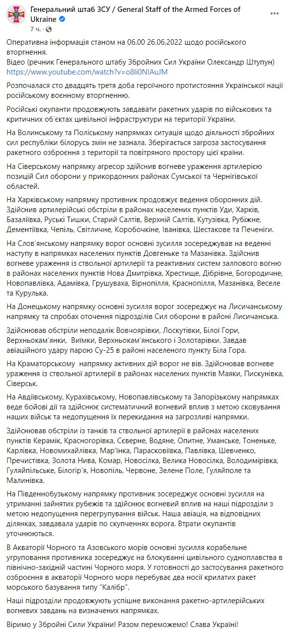Генеральный штаб Вооруженных сил Украины: Наибольшие потери противник понес на Бахмутском и Кураховском направлениях. Общие боевые потери противника с 24.02 по 26.06 ориентировочно составили: