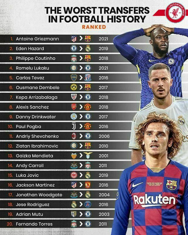 А первое место в рейтинге отдали переходу Антуана Гризманна из «Атлетико» Мадрид в «Барселону» за 120 миллионов евро. В целом в топ-6 сразу три трансфера «Барселоны»: также каталонцы отличились неудачными подписаниями Филиппе Коутиньо из «Ливерпуля» и Усмана Дембеле из «Боруссии» Дортмунд.