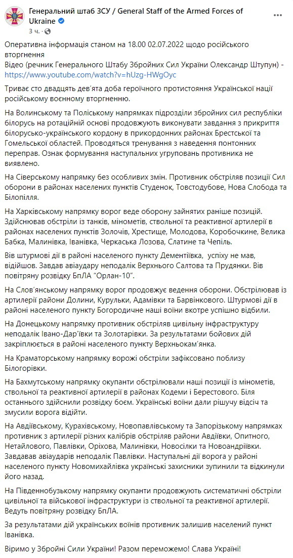 Генеральный штаб ВСУ: Общие боевые потери противника с 24.02 по 02.07 ориентировочно составили: