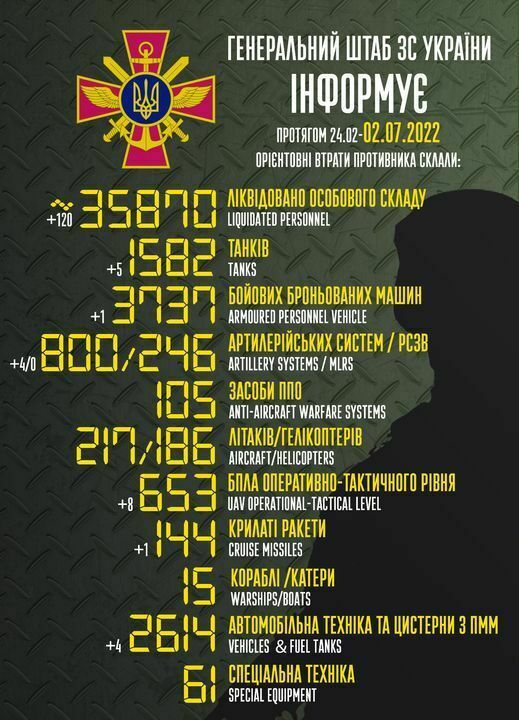 Вооруженные силы Украины по состоянию на 2 июля уже уничтожили 35870 российских оккупантов, 1582 танка и 800 артиллерийских систем.