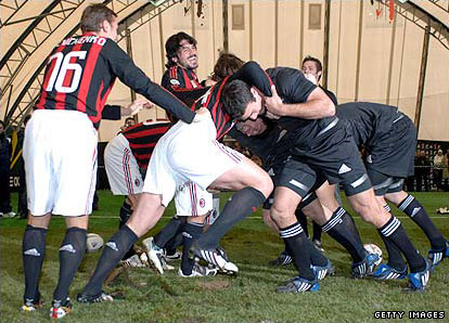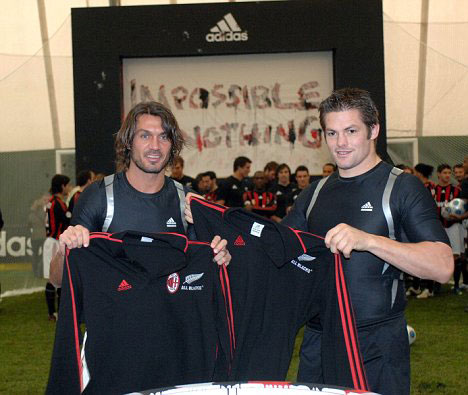 В рамках благотворительного проекта, а также для съемок очередного рекламного клипа из серии «Нет ничего невозможного», в тренировочный центр футбольного клуба «Милан» заглянули необычные гости – игроки сборной команды Новой Зеландии по регби. Фирма «Адидас» является спонсором обоих команд, миланских «Россонери»и новозеландских «Олл Блэкс». Возможно некоторые надеялись таким оригинальным способом еще и поднять боевой дух Милана после их обидного вылета из Кубка Италии – как известно «Люди в черном» являются одной из самых успешных команд регби в мире.