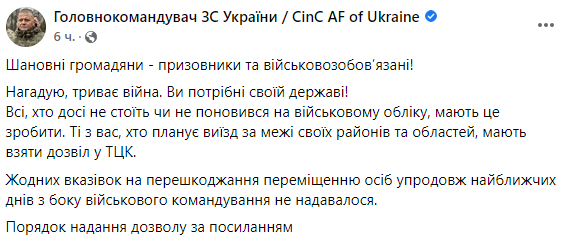 «Уважаемые граждане – призывники и военнообязанные! Напоминаю, идет война. Вы нужны своему государству! Все, кто до сих пор не стоит или не восстановился на военном учете, должны это сделать. Те, кто планирует выезд за пределы своих районов и областей, должны взять разрешение в ТЦК. Никаких указаний на препятствование перемещению лиц в течение ближайших дней со стороны военного командования не было».
