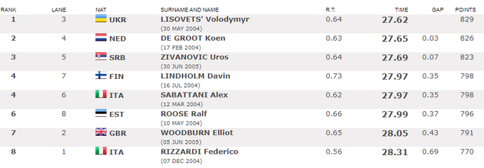 Лисовец выиграл финальный заплыв на дистанции 50 м брассом с результатом 27.62 сек, опередив спортсменов из Нидерландов и Сербии.